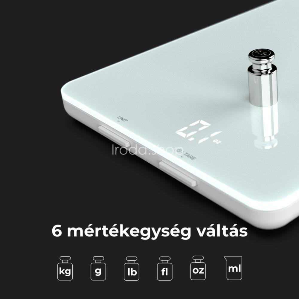 A letisztult LED kijelző jól olvasható, a 6 mérési egység (g, ml, kg, lb, oz, fl oz) támogatásával könnyedén váltható a mértékegység. A edzett üvegfelület és ABS ház könnyen tisztítható, és akár meleg ételt is mérhet rajta biztonságosan.