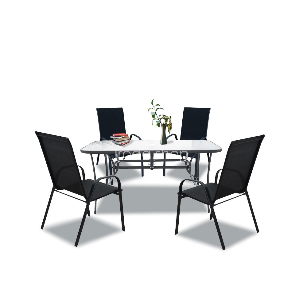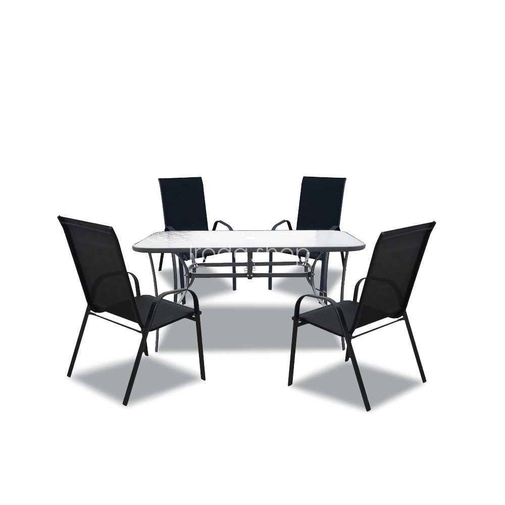 A modern kivitelű kerti bútorkészlet egy kerti üveglapos asztalt és 4 széket tartalmaz. A székek rteherbírása 120 kg. A bútorokat 4 fő számára tervezték. A székek és az asztal lábazata fémből készül. Az asztallap 5 mm-es edzett üvegből készült, amely ellenáll a kisebb karcolásoknak. Az textilén szék ülésanyaga ellenáll az időjárási viszonyoknak. Előnye az ergonómikusan profilált ülés és karfa, amelyek tehermentesítik a vállakat pihenés közben.