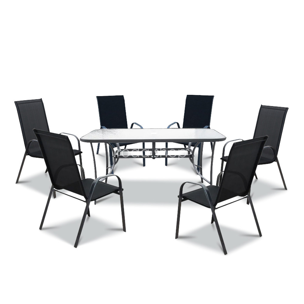 A modern kivitelű kerti bútorkészlet egy kerti üveglapos asztalt és 6 széket tartalmaz. A bútorokat 6 fő számára tervezték. A székek teherbírása 120 kg. A székek és az asztal lábazata fémből készül. Az asztallap 5 mm-es edzett üvegből készült, amely ellenáll a kisebb karcolásoknak. Az textilén szék ülésanyaga ellenáll az időjárási viszonyoknak. Előnye az ergonómikusan profilált ülés és karfa, amelyek tehermentesítik a vállakat pihenés közben.