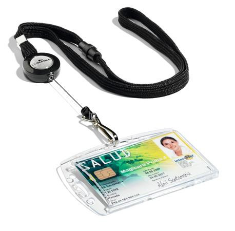 Azonosítókártya-tartó, kihúzható, karabineres, fekete nyakba akasztóval, DURABLE