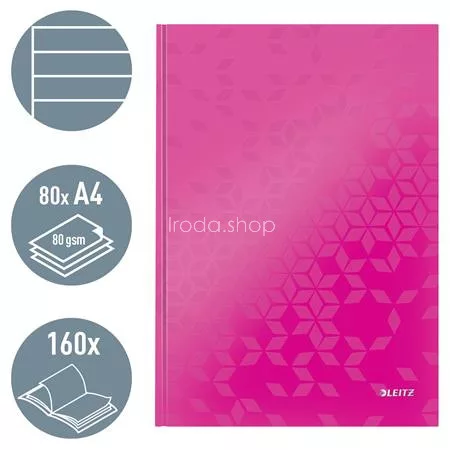Beíró, A4, vonalas, 80 lap, keményfedeles, LEITZ "Wow", rózsaszín