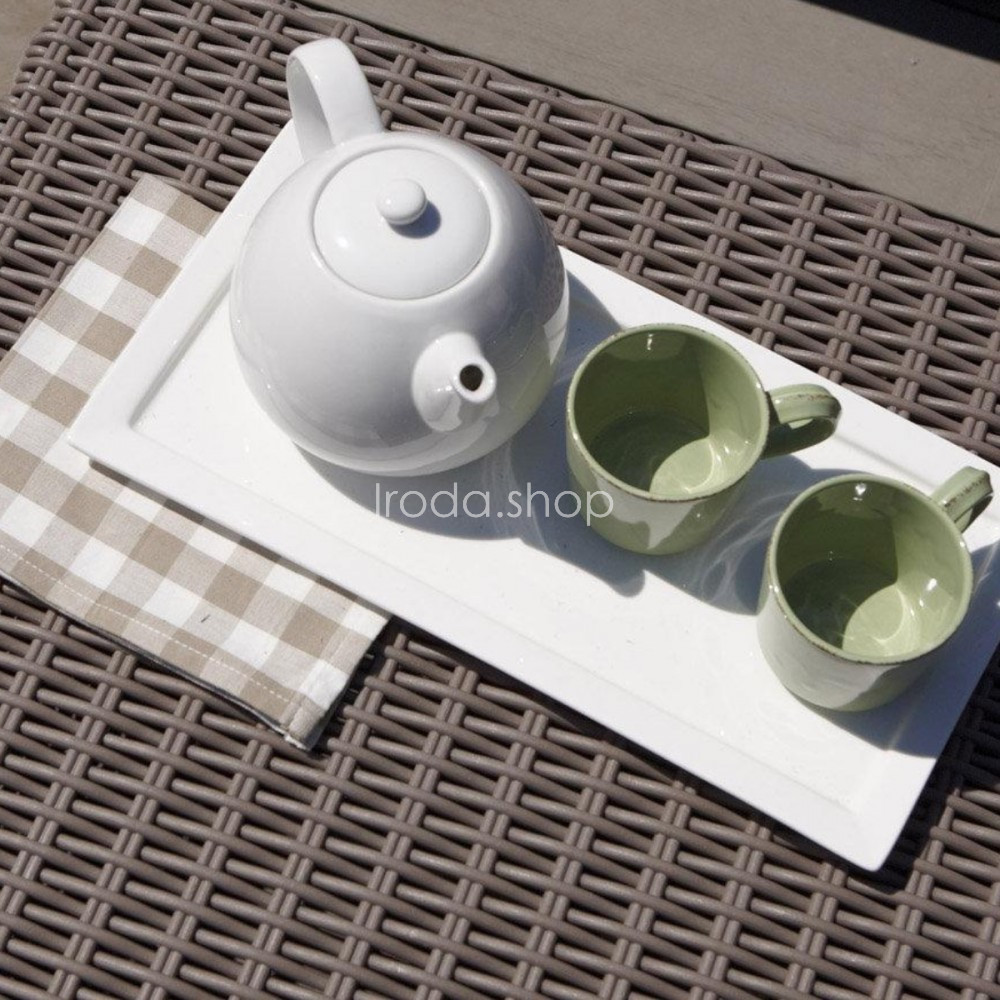 A barna színű asztalt az Allibert márka készítette, amely egy ismert csoportba tartozik (Curver és Keter mellett), amely fröccsöntött műanyag bútorok gyártásával foglalkozik. Ez a bútor vizuálisan emlékeztet a technorattan asztalokra, bár valójában polipropilénből készült. Ezt az anyagot kiváló ellenállás jellemzi a változó időjárási viszonyokkal, a napfénnyel és a hőmérséklet-különbségekkel szemben, ennek köszönhetően az asztal egész évben elérhető. A gyakorlatban ez azt jelenti, hogy egész évben kint állhat, anélkül, hogy elveszítené eredeti megjelenését. A bútorok nem igényelnek karbantartást, a legkeményebb szennyeződéseket is enyhe mosószerrel dúsított vízzel lehet eltávolítani.