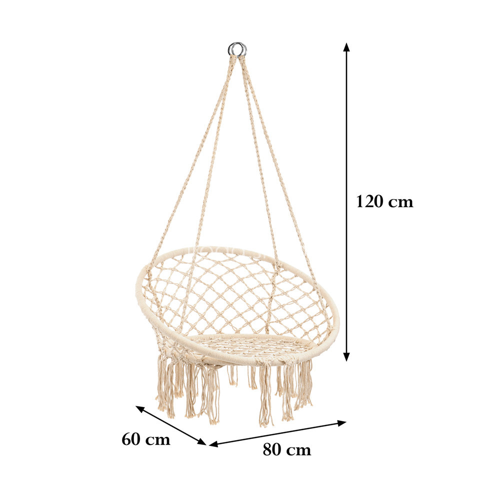 A bézs Cardenas bézs függőfotel kiválóan illeszkedik otthonod vagy teraszod méreteihez. Vasvázas pamut zsinórral rendelkezik, méretei 80x60x120 cm, ami ideális arányokat biztosít a kényelmes és kifinomult pihenéshez. Az 80 cm szélesség kényelmes helyet nyújt az üléshez és a test pozícionálásához, miközben a 60 cm mélység lehetővé teszi a test kényelmes elhelyezkedését. A 120 cm magasság pedig megfelelő távolságot biztosít a talajtól, hogy könnyedén beülhess a függőfotelbe. Emellett fontos megemlíteni, hogy a Cardenas függőfotel rendkívül tartós és stabil, hiszen terhelhetősége akár 180 kg is lehet. Tehát bátran élvezheted a kényelmet és nyugalmat, anélkül hogy aggódnod kellene a függőfotel megbízhatósága miatt.