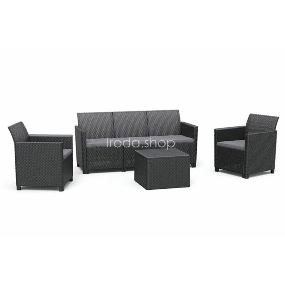 A grafit színben kapható kerti bútor szett könnyű, egyben tartós vázszerkezettel büszkélkedik. Mindennek tetejében roppantul könnyen tisztítható minden egyes eleme, így pillanatok alatt makulátlanná varázsolható az összkép. A grafit árnyalatban elérhető szetthez szürke párnák társulnak, melyek a maximális kényelmet hivatottak borítékolni, a divatos és szemre való megjelenés mellett. A bútorok erős és tartós műanyagból készültek. Az erős, tartós kialakítás nagyfokú megbízhatóságot jelent a gyakorlatban és azt, hogy a bútordarabok kivétel nélkül hosszú élettartamot biztosítanak, az örömteli, nyári napokat fűszerező használaton kívül, ami a fenti pozitívumoknak hála alap.