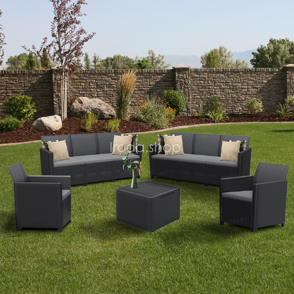 Ez egy rattan stílusra emlékeztető elegáns bútor szett két fotellel, két három személyes kanapéval és egy párnatartós asztallal. Ez a bútor szett kellemessé teszi a kertben vagy a teraszon töltött nyári napokat. A könnyű és egyúttal stabil szerkezetű bútorok tisztítása nagyon egyszerű. A szett ellenálló a sérülésekkel és az időjárás hosszan tartó viszontagságaival, illetve az UV sugárzással szemben is.