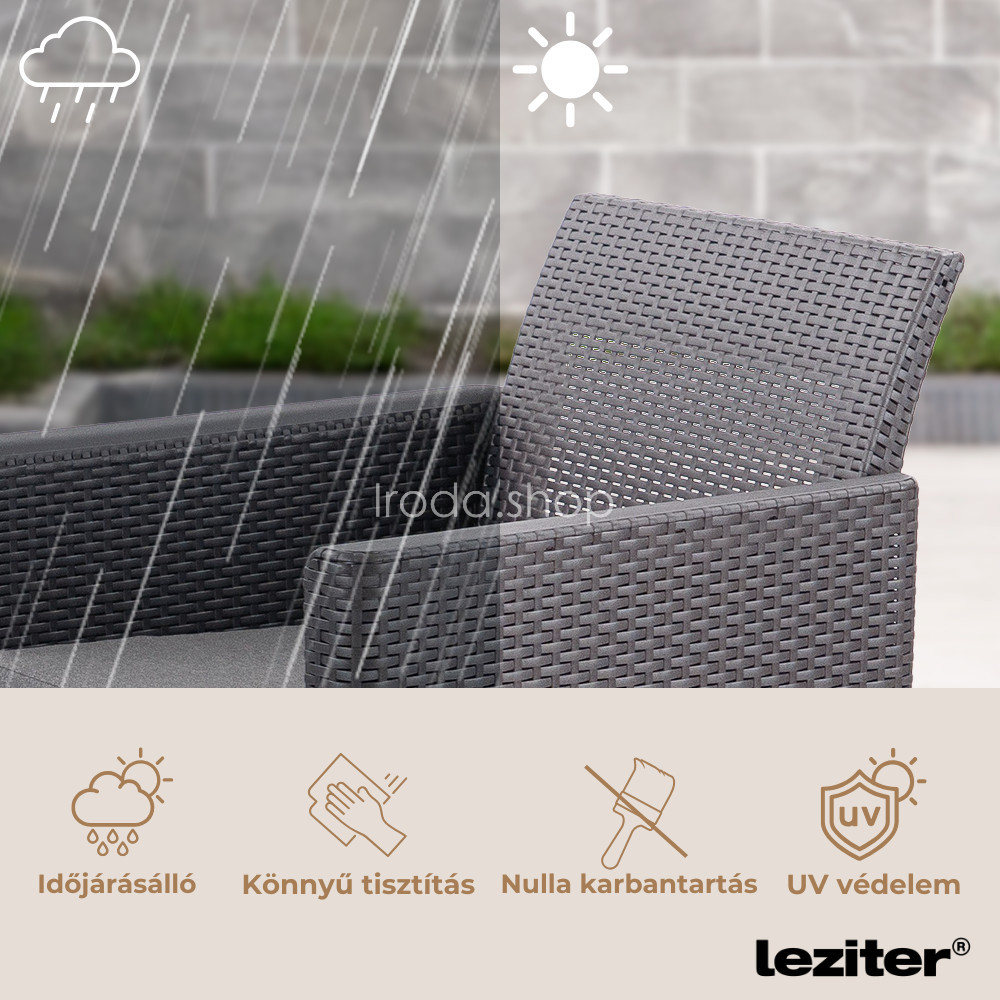 A garnitúra párnázott, így a pihenés minden pillanata igazi feltöltődést jelent. A rattan hatású bútorok nemcsak megjelenésükben esztétiksuak, de nagyfokú tartósságuknak és könnyű tisztíthatóságuknak köszönhetően hosszú távon is megőrzik szépségüket.