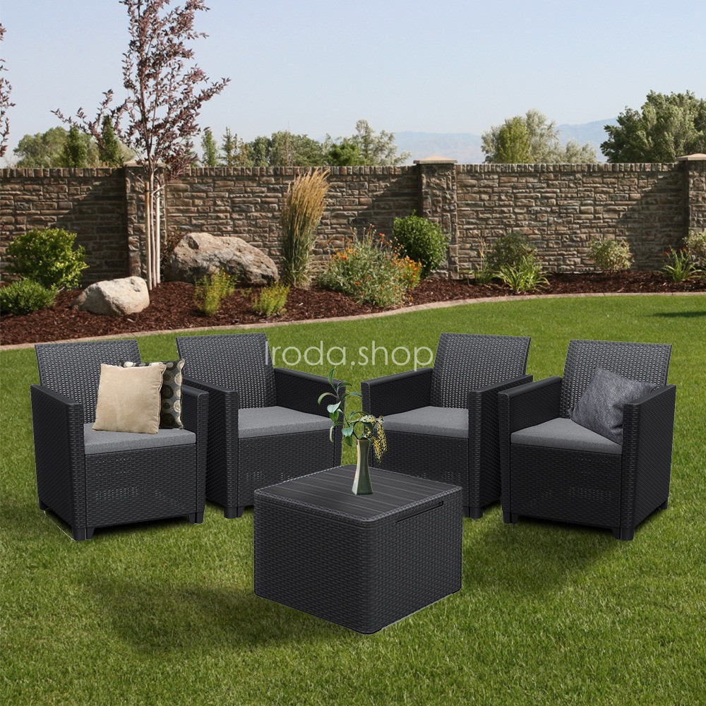 Ez egy rattan stílusra emlékeztető elegáns bútor szett négy fotellel és egy párnatartós asztallal. Ez a bútor szett kellemessé teszi a kertben vagy a teraszon töltött nyári napokat. A könnyű és egyúttal stabil szerkezetű bútorok tisztítása nagyon egyszerű. A szett ellenálló a sérülésekkel és az időjárás hosszan tartó viszontagságaival, illetve az UV sugárzással szemben is.