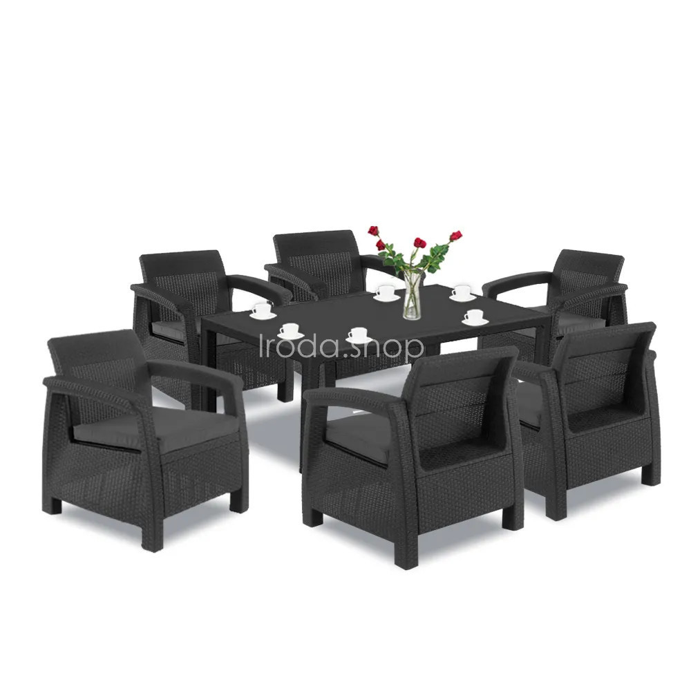 A stílusos Big duo szabadidő bútor szett maximális kényelmet garantál a felhasználók számára. A szettet modern dizájn jellemez, melyet természetes rattan fonás inspirált. A szett stabilitását és kényelmét szolid felépítésének és átgondolt szerkezetének köszönheti. A bútor szett hat egyszemélyes fotelt és egy asztalt tartalmaz. A Big termékvonal - kényelmes párnákkal kapható. A bútorok ellenállnak az időjárás viszontagságainak és az UV sugárzásnak.A bútorokat a Curver gyártja, kiknek termékei megtalálhatóak még Keter márkanév alatt is. A Big egy kiváló minőségű európai termék, amely a legjobb minőségű fröccsöntött műanyagból készült.