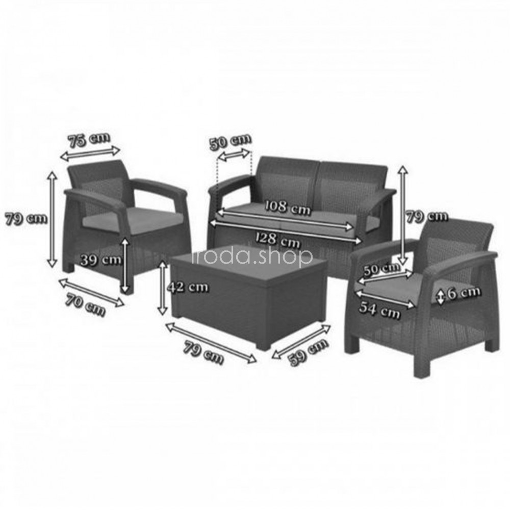 A bútorok tartós műanyagból készültek , amelyet a gyártási folyamat során a rattanra hasonlítottak. A bútorkészítéshez használt anyag azonban sokkal jobban ellenáll a természetes anyagának. Ez vízálló , ellenáll az UV sugárzásnak, így nem veszíti el színét, és nem érzékeny az időjárásra sem. Az anyag nagyon könnyen karbantartható. A víz elég ahhoz, hogy megtisztítsa. Használhat enyhe tisztítószereket is. A Korfu szettben két kényelmes fotel található, egy kanapé, amelyen két felnőtt elfér, és egy téglalap alakú asztal, amely ládaként szolgálhat. Az egyes üléspárnák és a kanapék akár 100 kg, a teljes kanapé pedig 200 kg terhelésnek tudnak ellenállni. A Corfu Box szett négy ülőhellyel rendelkezik , ami ideális a család vagy a barátok találkozásához és a teraszon vagy a kertben való kikapcsolódáshoz.