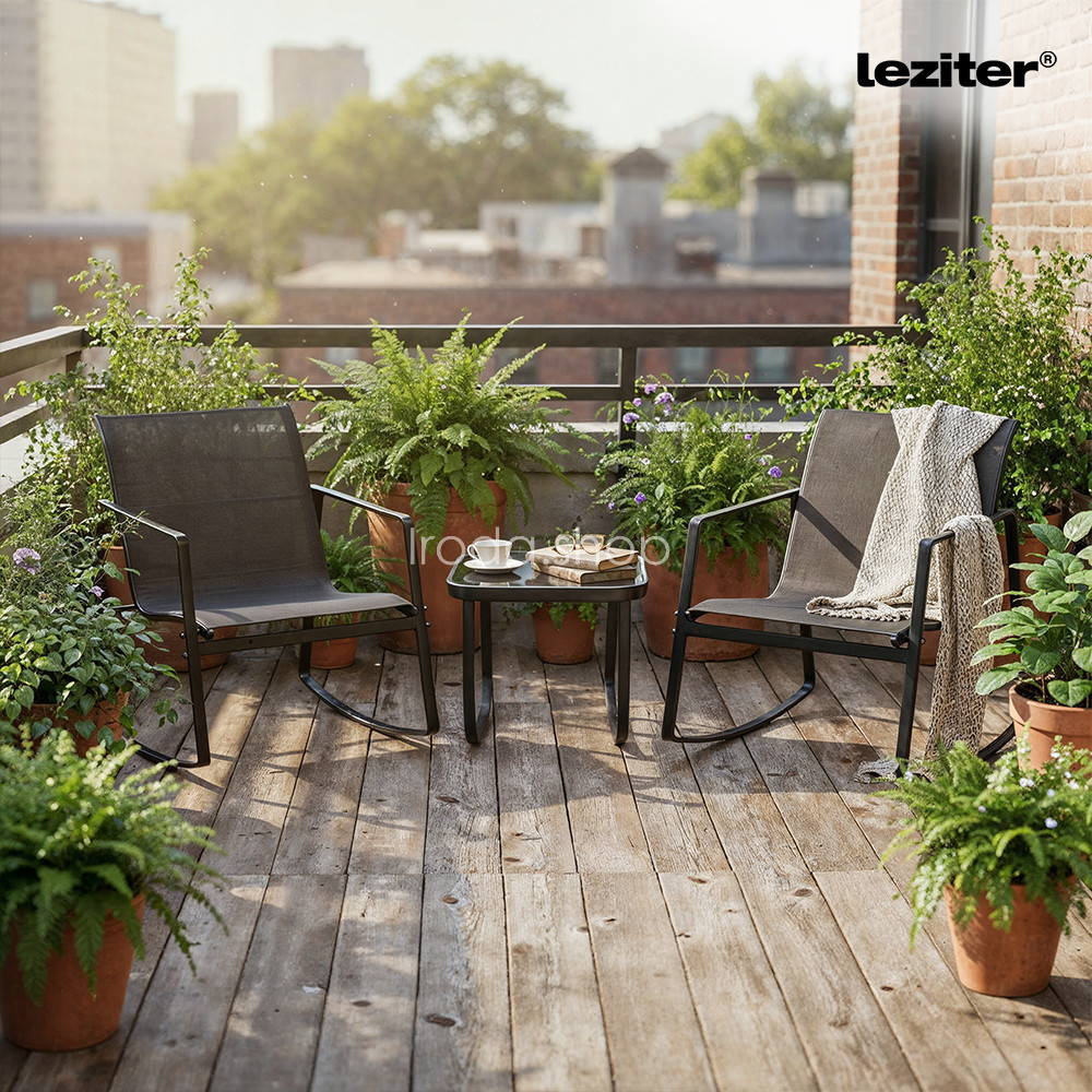 A Leziter Elva Balcony kerti bútor garnitúra szett kompakt kialakítású összeállítás, amely két hintaszékből és egy kávézóasztalból áll. A szett méretezése lehetővé teszi, hogy kisebb erkélyeken, teraszokon vagy városi kültéri terekben is jól használható legyen. A hintaszékek kialakítása pihenéshez és rövid kávézáshoz egyaránt alkalmas elrendezést biztosít.