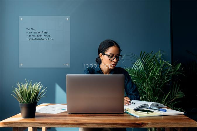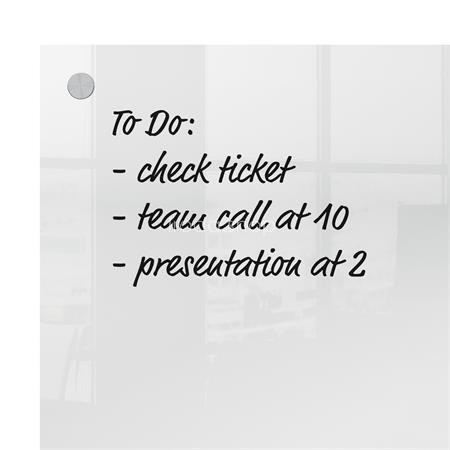 Mini fehértábla modern, keret nélküli kialakítással, otthoni és irodai használatra, jegyzeteléshez, gondolatok, ötletek vagy fontos dátumok feljegyzéséhez. A sarkokon keresztül falra szerelhető és az átlátszó kialakításnak köszönhetően észrevétlenül beleolvad a környezetébe, amikor nincs használatban. Könnyen tisztítható felület; egyszerűen írjon rá és törölje le. - szárazon törölhető - tartozék: 1 db táblafilc - méret: 300x300 mm - függőlegesen vagy vízszintesen is felszerelhető - 1 év garancia a felületre