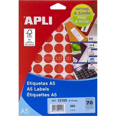 Etikett, 19 mm kör, színes, A5 hordozón, APLI, piros, 560 etikett/csomag
