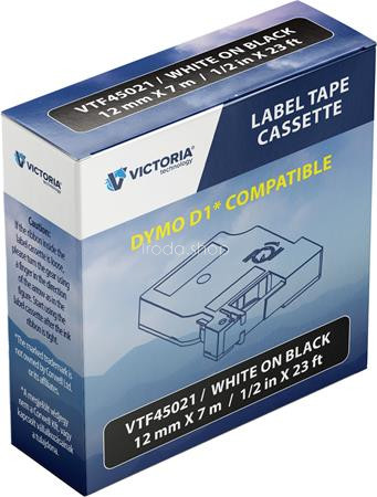 Feliratozógép szalag, 12 mm x 7 m, VICTORIA TECHNOLOGY, fekete-fehér