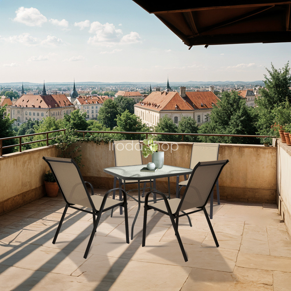 A modern kivitelű kerti bútorkészlet egy kerti üveglapos asztalt és 4 széket tartalmaz, melyek teherbírása 120 kg. A bútorokat 4 fő számára tervezték. A székek és az asztal lábazata fémből készül. Az asztallap 5 mm-es edzett üvegből készült, amely ellenáll a kisebb karcolásoknak. Az textilén szék ülésanyaga ellenáll az időjárási viszonyoknak. Előnye az ergonómikusan profilált ülés és karfa, amelyek tehermentesítik a vállakat pihenés közben.