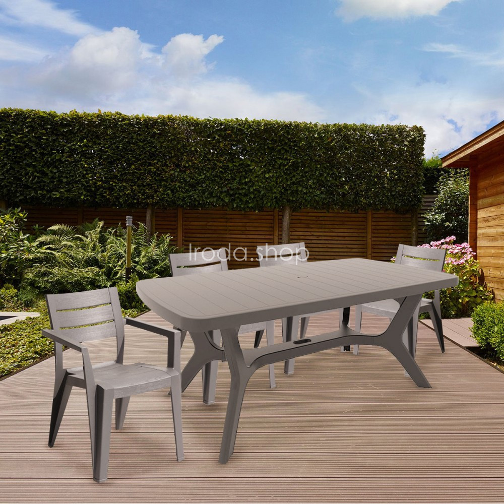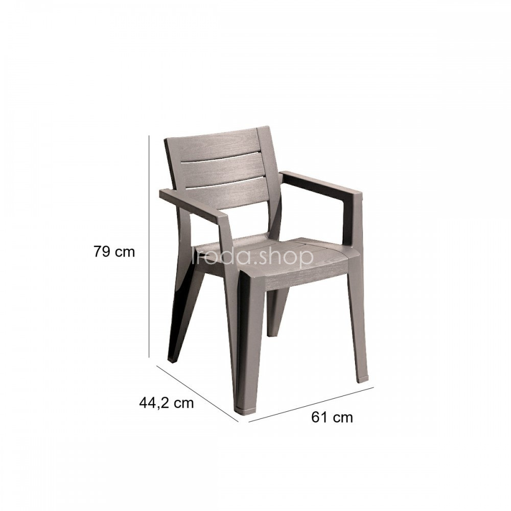 A Juliemore egy modern kerti bútor szett, amely a megfelelően profilozott háttámlájának köszönhetően rendkívül kényelmes. A bútor könnyű, szolid és ellenáll az időjárás viszontagságainak és az UV sugárzásnak. A székek egymásra helyezhetők, ami segít helyet megtakarítani és könnyebbé teszi a tárolását.