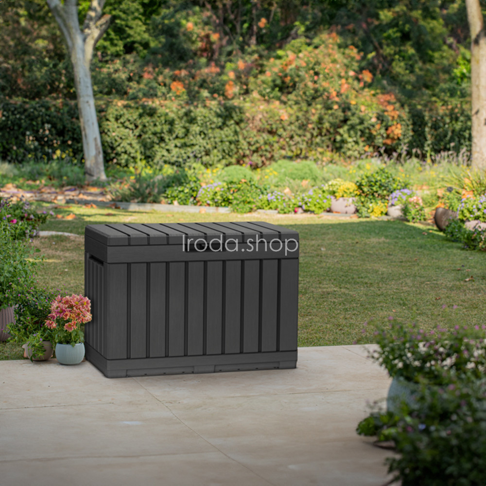 A Kentwood Storage Box 190L kettős célú elem: tárolódoboz és extra ülőhely. Ideális tároló kerti kiegészítők, öntözőkannák, edények, párnák vagy kisebb kerti szerszámok és gyerekjátékok tárolására. A legjobb minőségű gyanta anyagból készült, hatékonyan védi a benne tárolt tárgyakat a nedvességtől, a szennyeződéstől és az UV sugárzástól.
