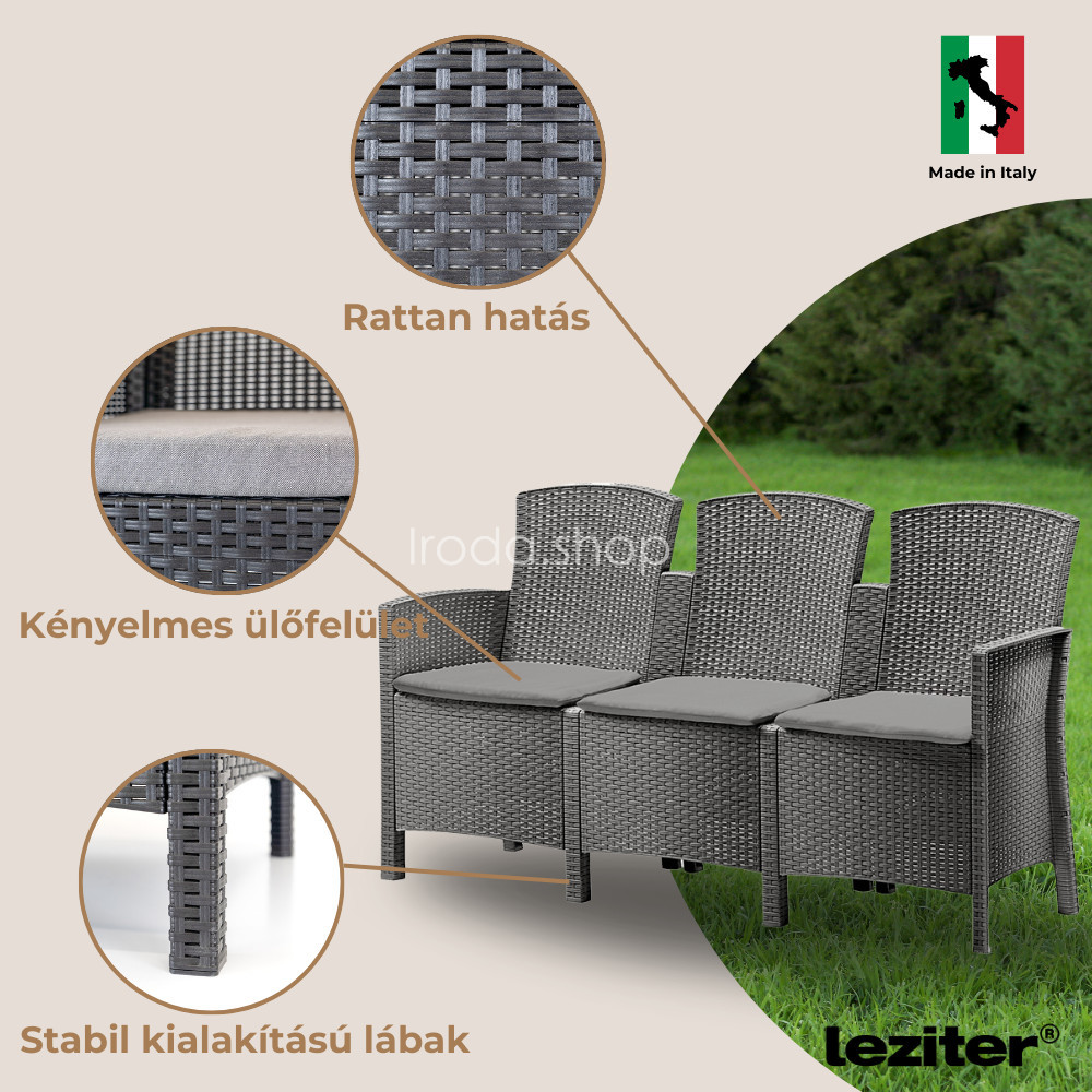 A grafit szín és az eredeti rattan hatású textúra miatt ez a kanapé könnyedén illeszkedik modern és klasszikus stílusú kertekbe, teraszokra vagy akár éttermi területekre is. Kompakt mérete (167 x 59 x 90 cm) lehetővé teszi, hogy kisebb teraszokon is jól mutasson, miközben elegendő helyet biztosít a kényelmes ücsörgéshez.
