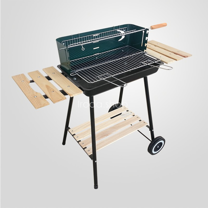 Funkcionális és könnyen grillezhető téglalap alakú grillrács kerekeken. További 2 fa oldalsó polc és egy kiegészítő polc található a terméken.