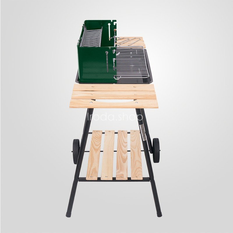 Téglalap alakú kerti grill három fa polccal és egy nyársal