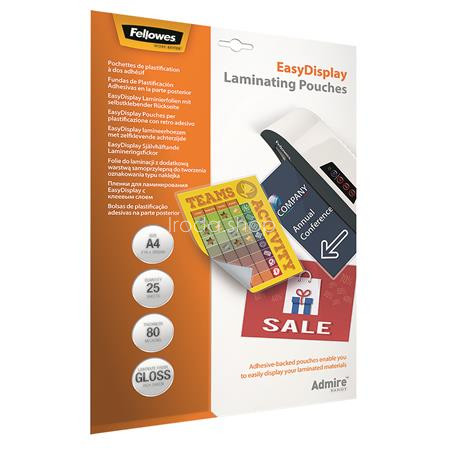 Meleglamináló fólia, 80 mikron, A4, fényes, öntapadó, 25 db, FELLOWES "Admire Easy Display"