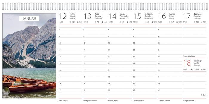 Minden irodában nélkülözhetetlen. Senki sem vitathatja, hogy az asztali naptárak az irodavilág egy leghasznosabb segítői. Ha Önnek fontos a pontosság, az időpontok betartása és ezáltal az ügyfelek elégedettsége, akkor a cég egyik asztaláról sem hiányozhatnak ezek a tervező alkalmatosságok. -időbeosztás: félórás, 8-17.00 h -magyar-angol-német nyelvű naptárháló -névnapok, magyar ünnepek és hasznos információk minden napra -extra sorok a munkaidőn túli események feljegyzésére -elegáns fém ikerspirál a szebb megjelenésért -magyar-angol nyelvű képleírások -válogatott színes képek minden hétre -méret: 320x150 mm -reklámfelület: 320x40 mm -27 lap -54 kép -lap típusa 115 g/m2, fehér ofszet