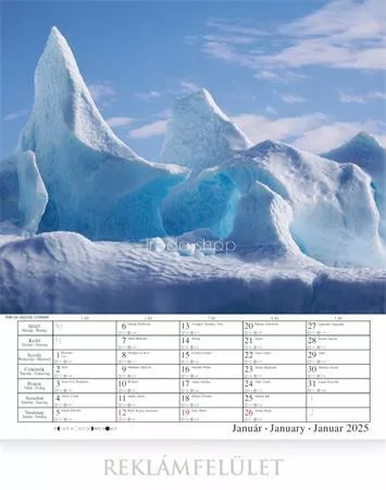 -naptár rész: magyar, angol, német nyelven, magyar  ünnepek  és névnapokkal, napkelte, napnyugta és holdállás  feltüntetésével