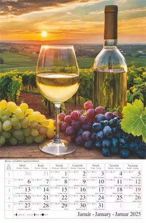 -naptár rész: magyar, angol, német nyelven, magyar  ünnepek  és névnapokkal, napkelte, napnyugta és holdállás  feltüntetésével
