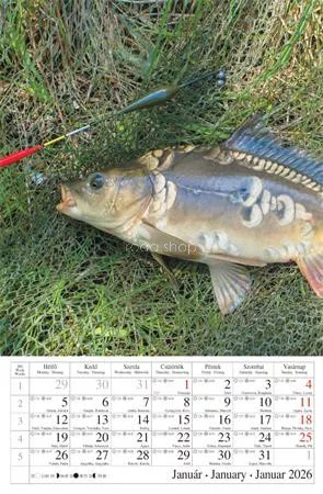 -naptár rész: magyar, angol, német nyelven, magyar  ünnepek  és névnapokkal, napkelte, napnyugta és holdállás  feltüntetésével