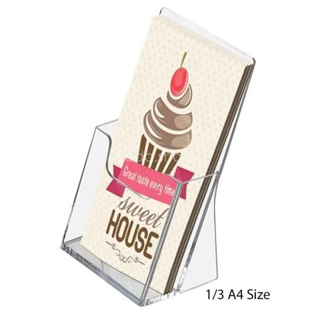 Az 1/3 A4 (DL) méretű asztali szórólaptartó elegáns és praktikus megoldás prospektusok, menük vagy termékleírások kihelyezésére.