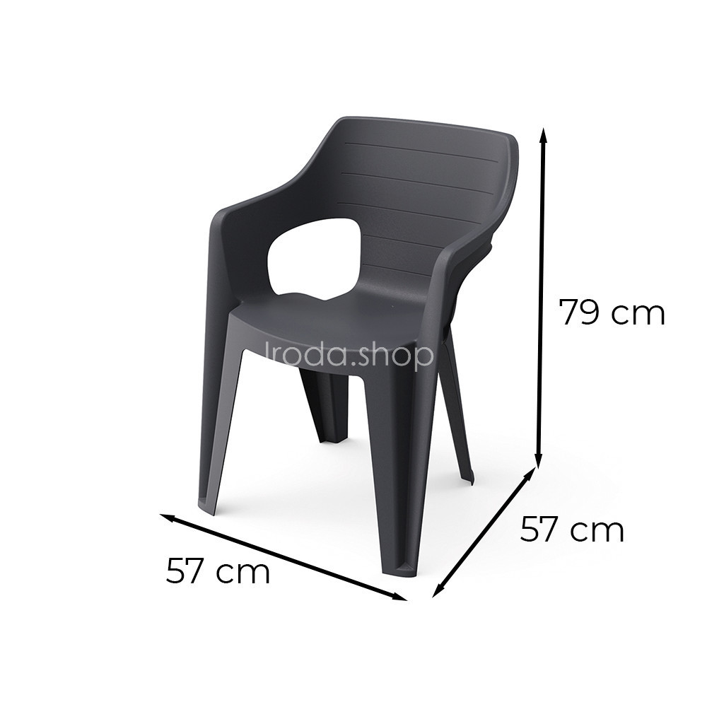 Az ergonomikus, kartámaszos kialakítás kényelmes ülést kínál, miközben a vízelvezető nyílás gondoskodik róla, hogy egy zápor után se maradjon pocsolya az ülőlapon. Ha nincs szükség az összes székre, egyszerűen egymásra rakhatod őket – ideális megoldás kisebb erkélyre, teraszra vagy szezonon kívüli tárolásra. A teljesen műanyag szerkezet korróziómentes és nem igényel festést vagy lakkozást.