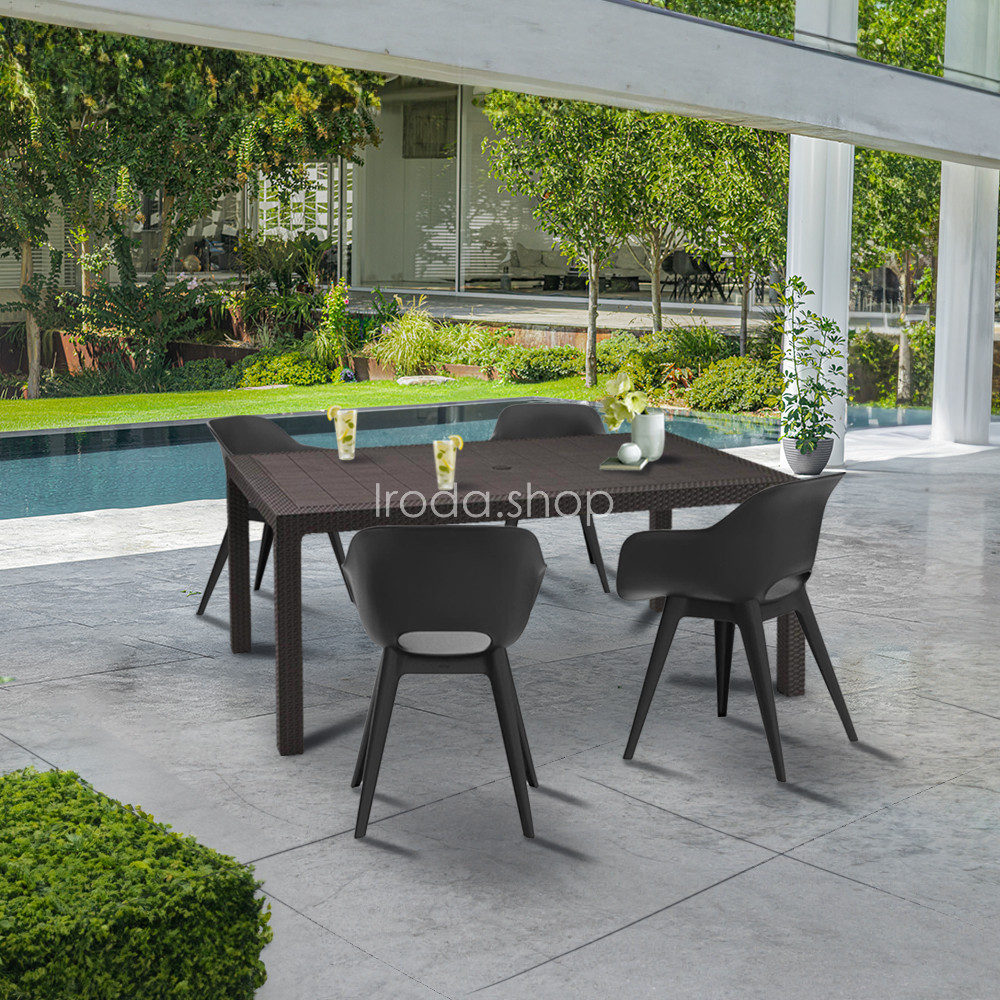 Kinézete a rattan anyagára elékeztet, de valójában egy kiváló minőségű müanygaból készül. Az asztallap sík, így lehetővé teszi a tányérok egyszerű elhelyezését rajta. Az asztal közepén egy nyílás van a napernyő részére. A négyszögletes asztal mindenki tetszését elnyeri, aki értékeli a letisztult stílust és az egyszerűséget. A termék összeszerelése könnyű, tisztítása egyszerű. Az asztal ellenáll a sérüléseknek, valamint az időjárás hosszantartó viszontagságainak.