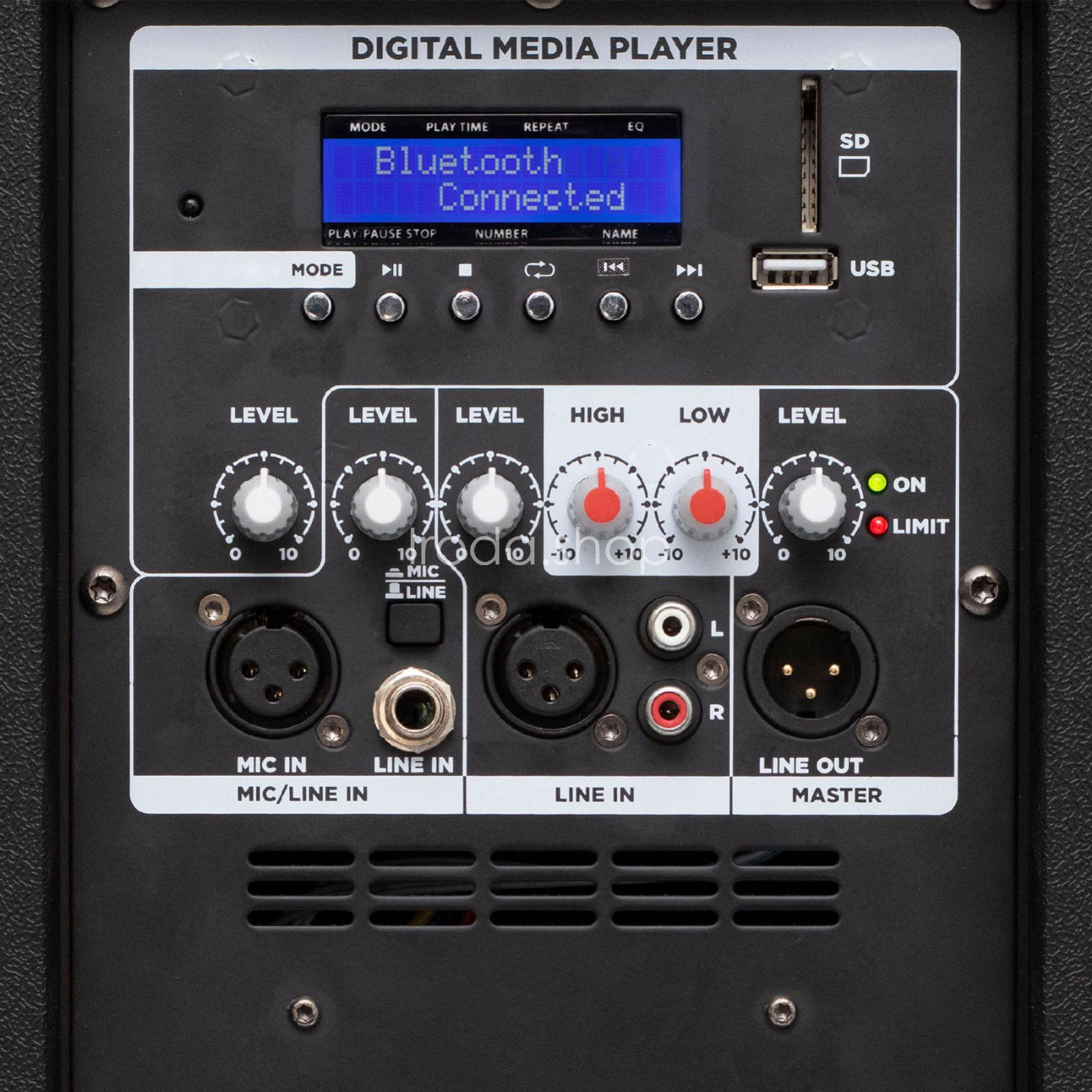 A hangdoboz MIC bemenettel (XLR), LINE 1 és LINE 2 (6,3 mm jack és RCA), valamint XLR vonalkimenettelis felszerelt, így egyszerre több eszköz vagy mikrofon is csatlakoztatható. A magas- és mélyhangszínszabályzóvalminden hangzás egyéni igények szerint testre szabható. Továbbá a rendszer tetszőleges számú hangdoboz sorolását is lehetővé teszi, így könnyedén bővíthető.