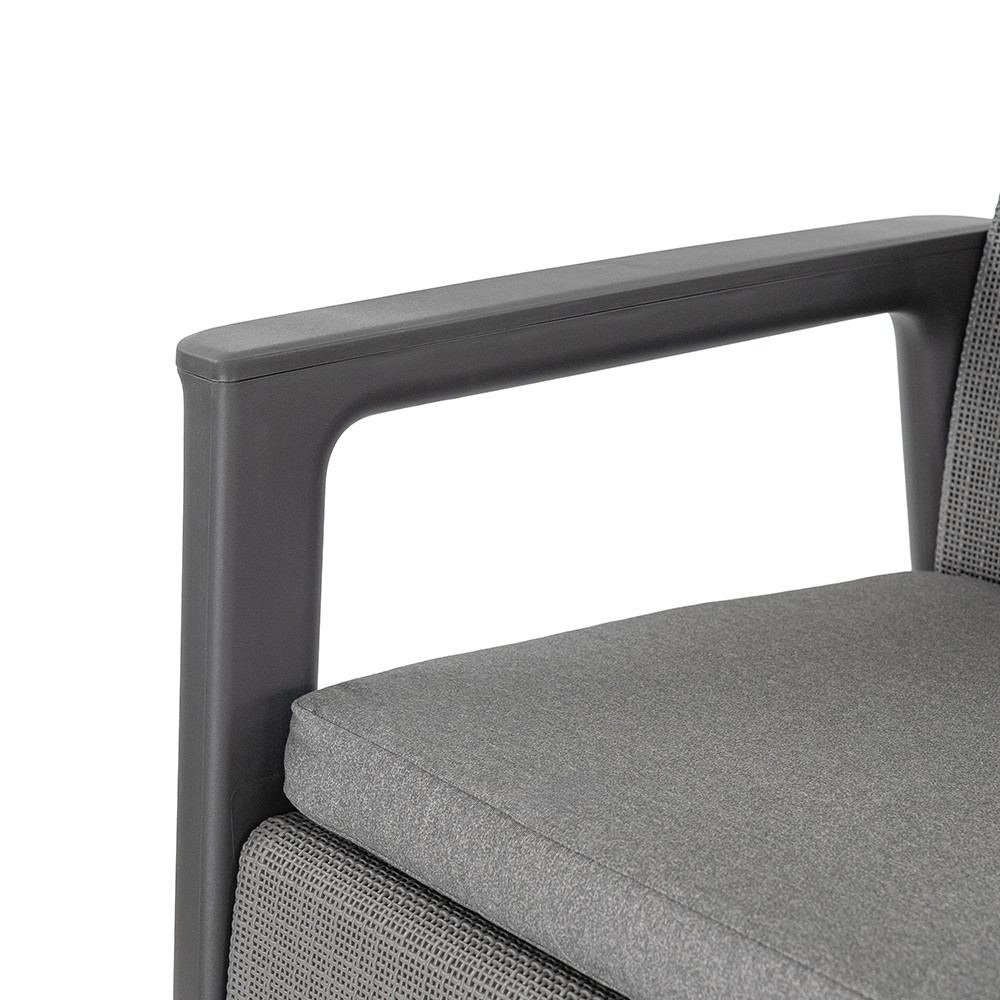 A szett kényelmes beszélgetősarkot alakít ki a kertben vagy a teraszon. Egységes, modern kültéri nappali hozható létre vele, miközben a tárolós asztal praktikus helyet biztosít a kiegészítőknek. Időjárásálló, gondozásmentes megoldás, amely rendezetten és átgondoltan formálja a kültéri teret.