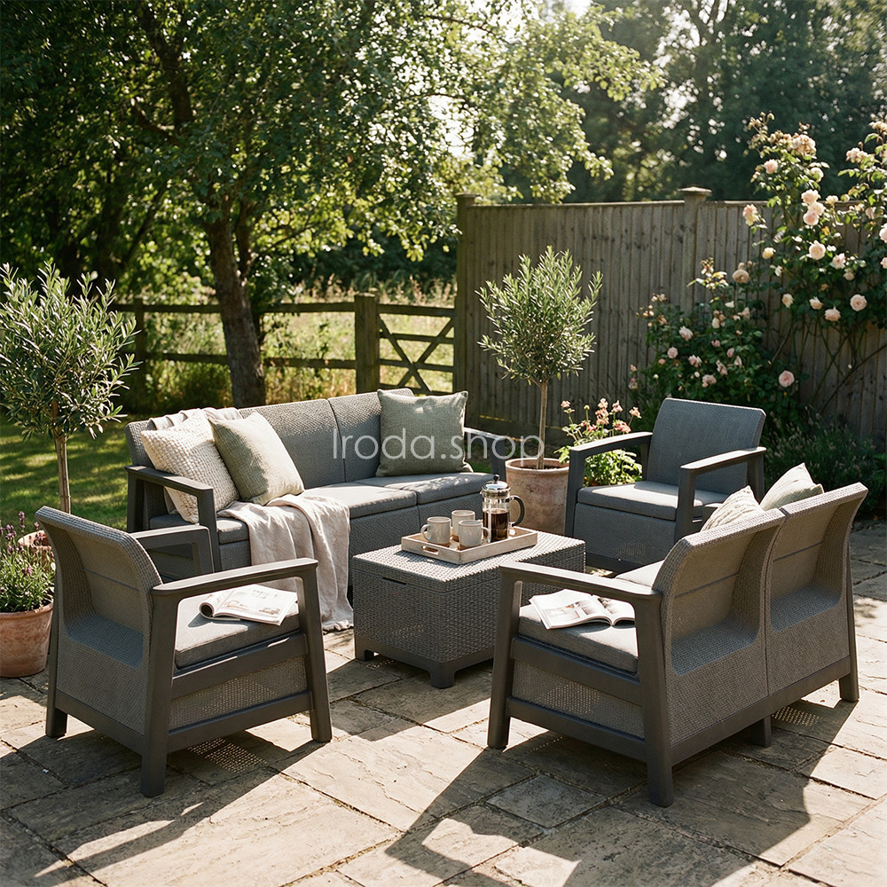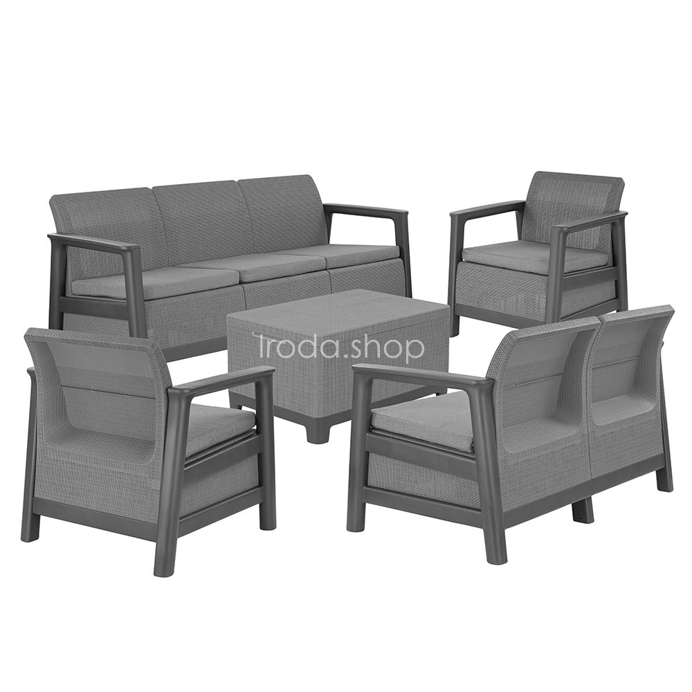 A szett kényelmes beszélgetősarkot alakít ki a kertben vagy a teraszon. Egységes, modern kültéri nappali hozható létre vele, miközben a tárolós asztal praktikus helyet biztosít a kiegészítőknek. Időjárásálló, gondozásmentes megoldás, amely rendezetten és átgondoltan formálja a kültéri teret.