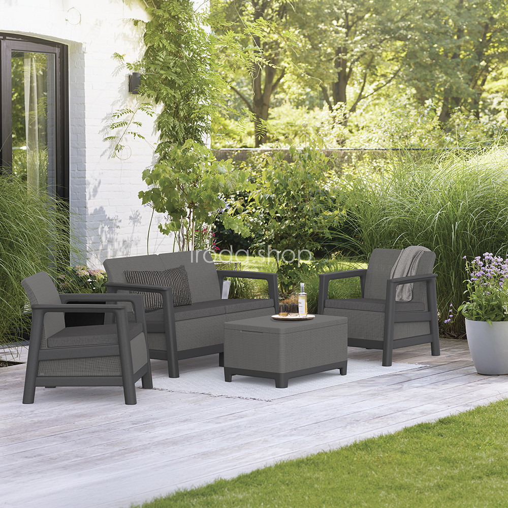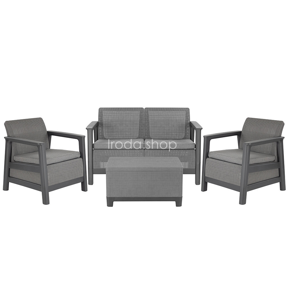 A szett kényelmes beszélgetősarkot alakít ki a kertben vagy a teraszon. Egységes, modern kültéri nappali hozható létre vele, miközben a tárolós asztal praktikus helyet biztosít a kiegészítőknek. Időjárásálló, gondozásmentes megoldás, amely rendezetten és átgondoltan formálja a kültéri teret.