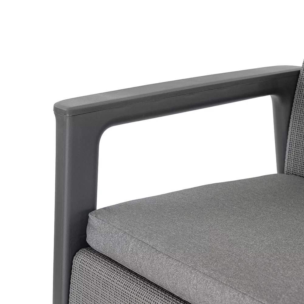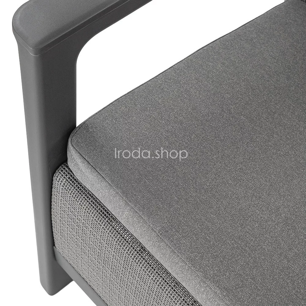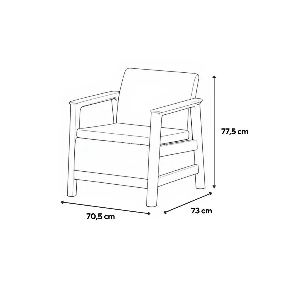 A stabil lábszerkezet és a karfás kialakítás kényelmes alátámasztást biztosít. Egy kanapé ideális két fő számára, a fotel pedig arányos és jól kihasználható ülőhelyet kínál. Tartós kerti bútor választás mindennapi használatra.