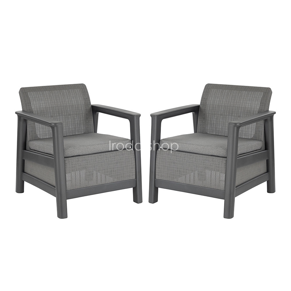 A Scandi Linea Duo kerti fotel szett letisztult, egységes formavilágot képvisel. A grafit–hűvös szürke árnyalat texturált felület természetes megjelenést biztosít, amely jól illeszkedik zöld környezethez és modern kültéri burkolatokhoz. A két fotelből álló összeállítás harmonikus ülőhelyet teremt teraszon, kertben vagy tágas erkélyen, miközben a visszafogott színvilág könnyen kombinálható más Scandi elemekkel.