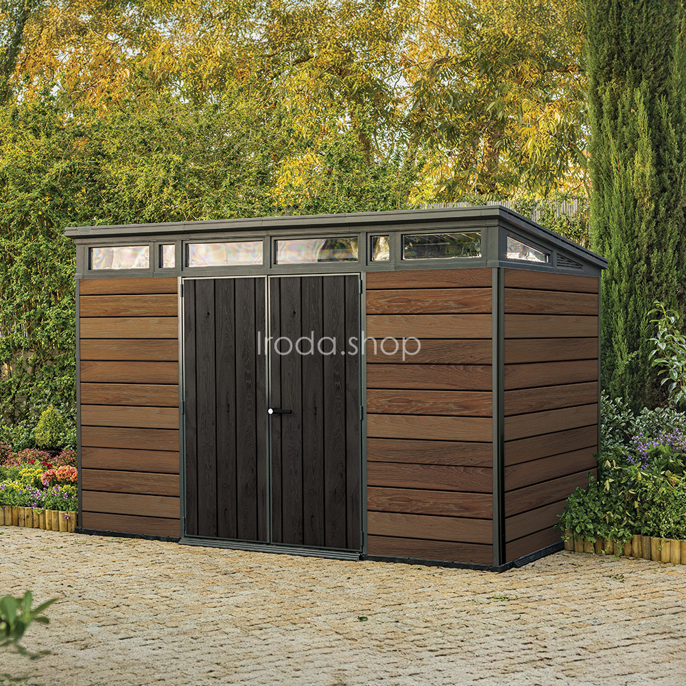A Signature PENT 11x7 kerti ház ötvözi az esztétikát és a funkcionalitást. A ferde tető és letisztult vonalvezetés tökéletesen illeszkedik a modern kertépítési trendekhez, míg a dió színű DECOCOAT technológia időjárásálló felületet biztosít.