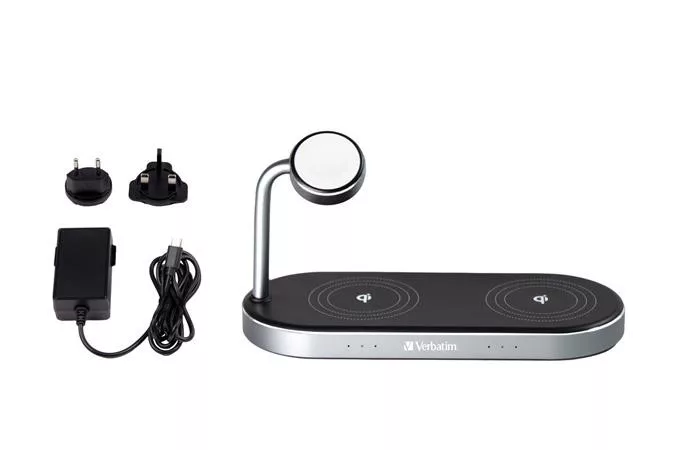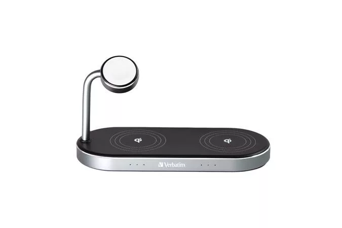 A Verbatim 3 az 1-ben töltőállomással minden eszközét vezeték nélkül töltheti fel egyszerre. Vezeték nélkül töltse fel Apple Watch-ját és két iPhone-ját (8 vagy újabb) vagy más Qi-tanúsítvánnyal rendelkező vezeték nélküli töltésre alkalmas eszközt.