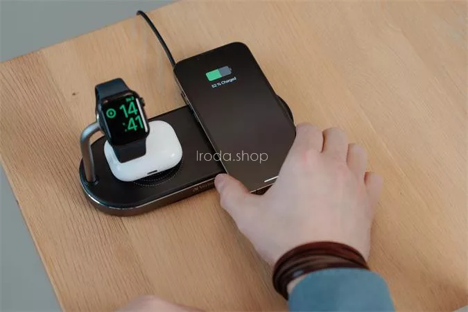 -3-az-1-ben: Apple Watch és két iPhone (8 vagy újabb) vagy más Qi-tanúsítvánnyal rendelkező vezeték nélküli töltésre alkalmas eszközhöz