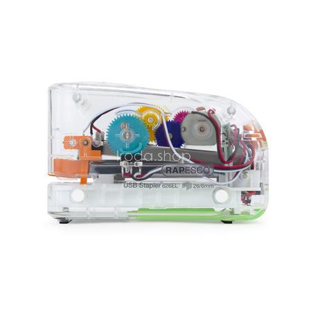 Tűzőgép, 26/6, 15 lap, elemes, USB töltővel, RAPESCO "626EL", átlátszó