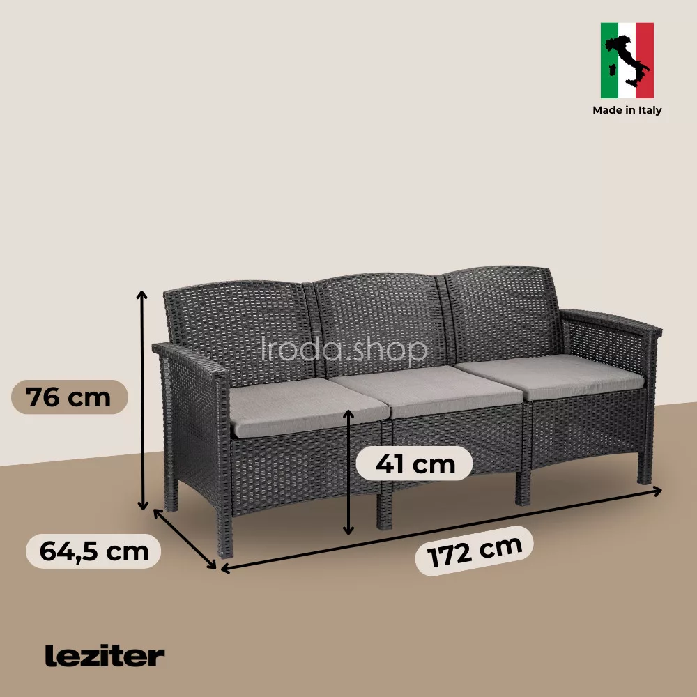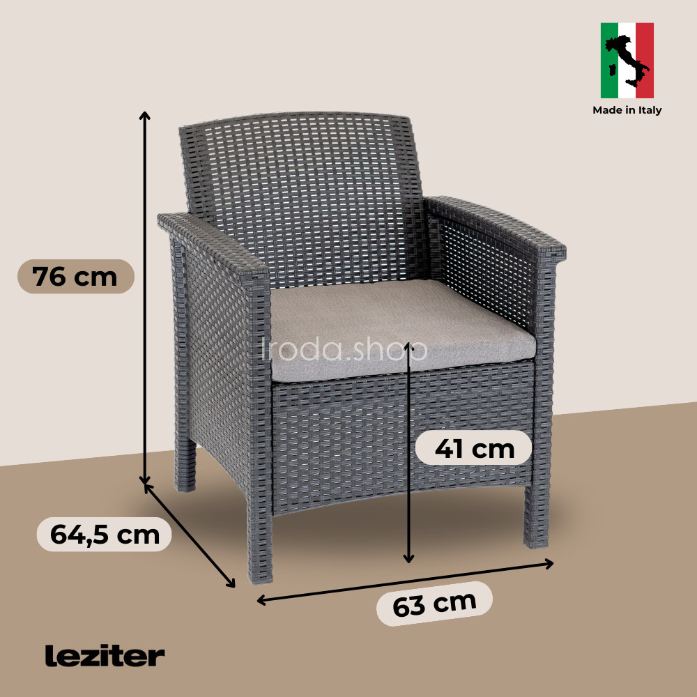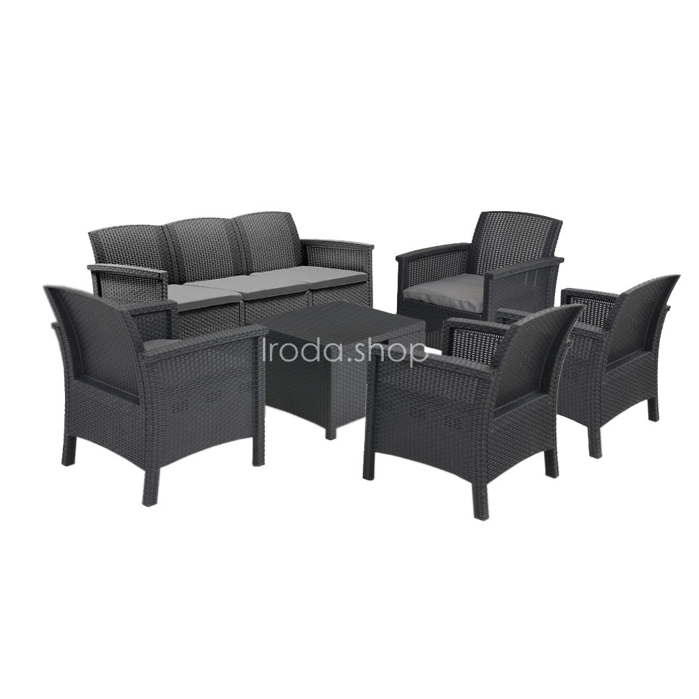 Ez az Olaszországban gyártott grafit színű, kényelmes és elegáns bútor szett négy darab 63 x 64,5 x 76 cm-es fotelt, egy darab 172 x 64,5 x 76 cm-es három személyes kanapét és egy 60 x 54,5 x 40,5 cm-es négyszögletes alacsony asztalt foglal magába. Ez egy olyan összeállítás, melyet bármilyen térben jól el tudsz rendezni, hogy a társaságod kényelmesen leültesd.