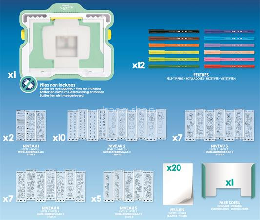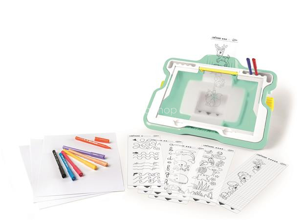 Komplett rajzkészlet a rajzolás tanulásához. A táblába épített fény megvilágítja a behelyezett fóliát, megkönnyítve így az átrajzolását. 4 éves kortól ajánlott. 5 különböző nehézségi fok a különböző korosztályok számára Elemmel működik (nem tartozék) Készlet tartalma: 1 db világító rajztábla 12 db filctoll 2 ív gyakorló lap 6 ív „lépésről lépésre” lap 22 ív komplett rajz 20 ív rajzlap 1 db árnyékoló Gyártó/első EU forgalmazó elérhetősége: MAPED SAS 530 route de Pringy - 74370 Argonay sophie.souillard@maped.fr www.maped.com