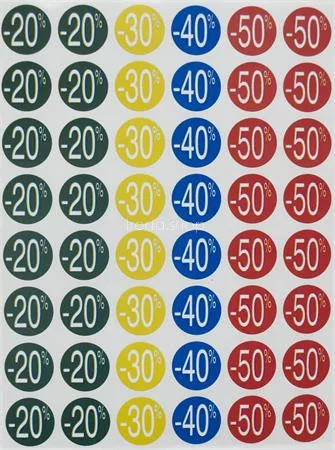 Színes, előnyomott kör címkék különböző kedvezmények jelölésére. Átlátható és figyelemfelkeltő megoldás akciókhoz!
