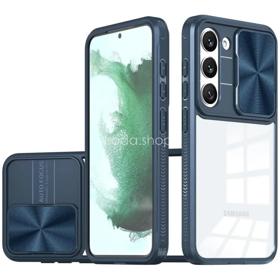 Samsung Galaxy A13 4G SM-A135F / A137F, Műanyag hátlap + szilikon keret, átlátszó akril hátlap, kamera védelem, Wooze Trendy, sötétkék